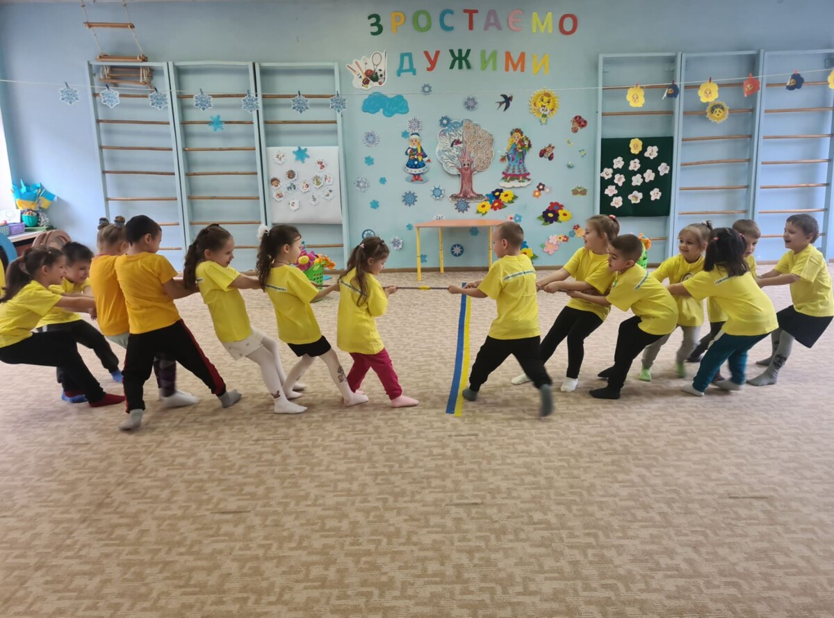 Малята весело проводять час під час фізкультурної розваги, заряджаючись позитивною енергією та радістю руху.
