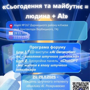 28 листопада 2025 року Ліцей №267 Дарницького району м.Києва став майданчиком, де народжуються сміливі ідеї, звучать чесні запитання та формується погляд у майбутнє. Освітній форум “Сьогодення та майбутнє = людина + AI”, проведений у межах місячника інформаційної просвіти та приурочений до дня народження ChatGPT, об’єднав учнів, педагогів і технології в живому, натхненному діалозі.