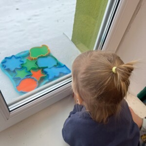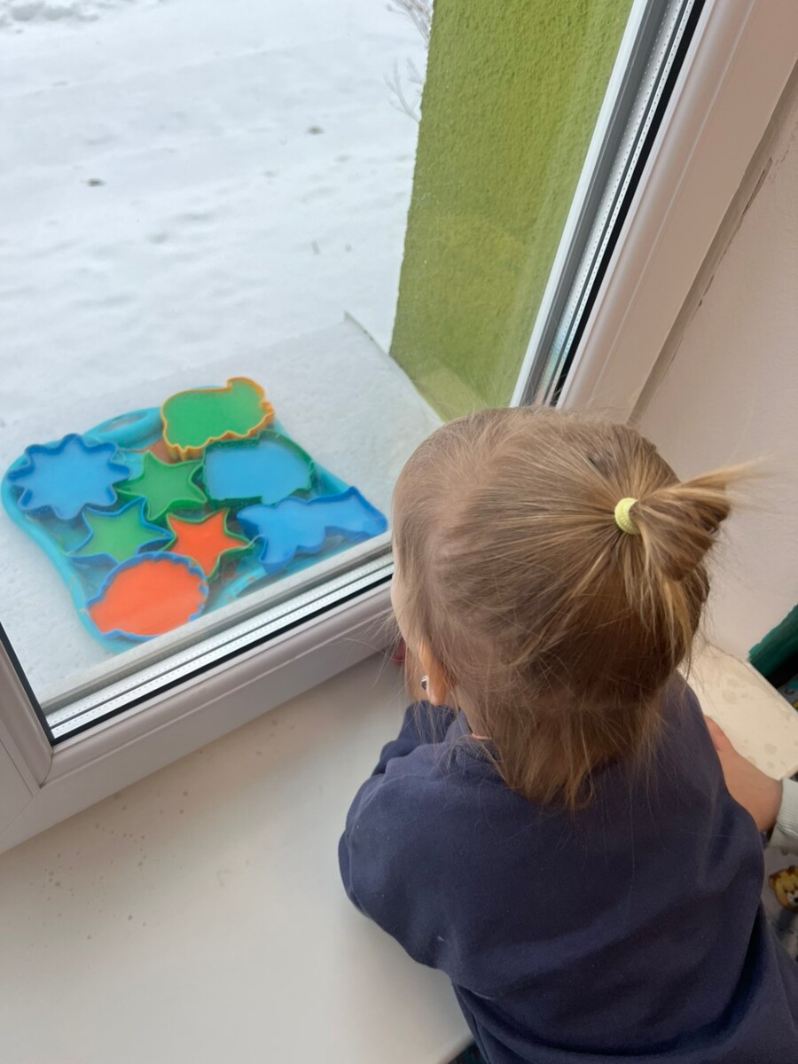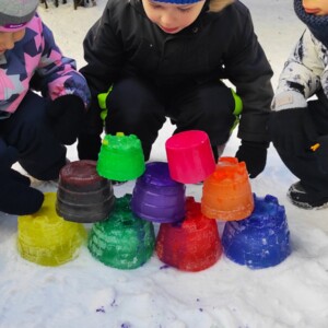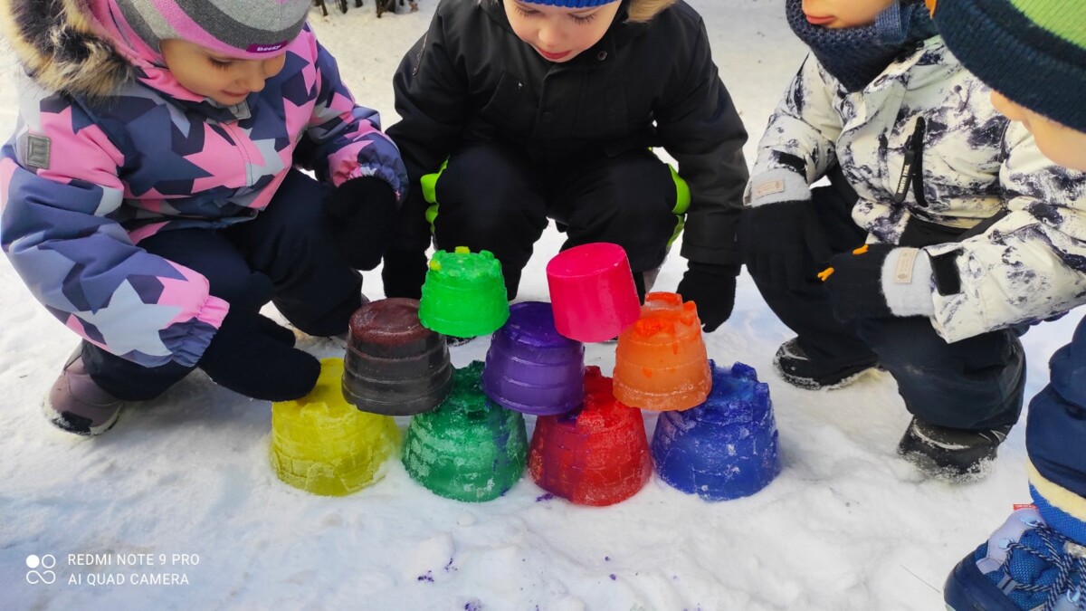 🌈 Продовженням експерименту стала гра на свіжому повітрі: пофарбованим льодом діти прикрашали дерева й сніговиків, ховали яскраві шматочки у сніг, викладали імена, слова та цифри.