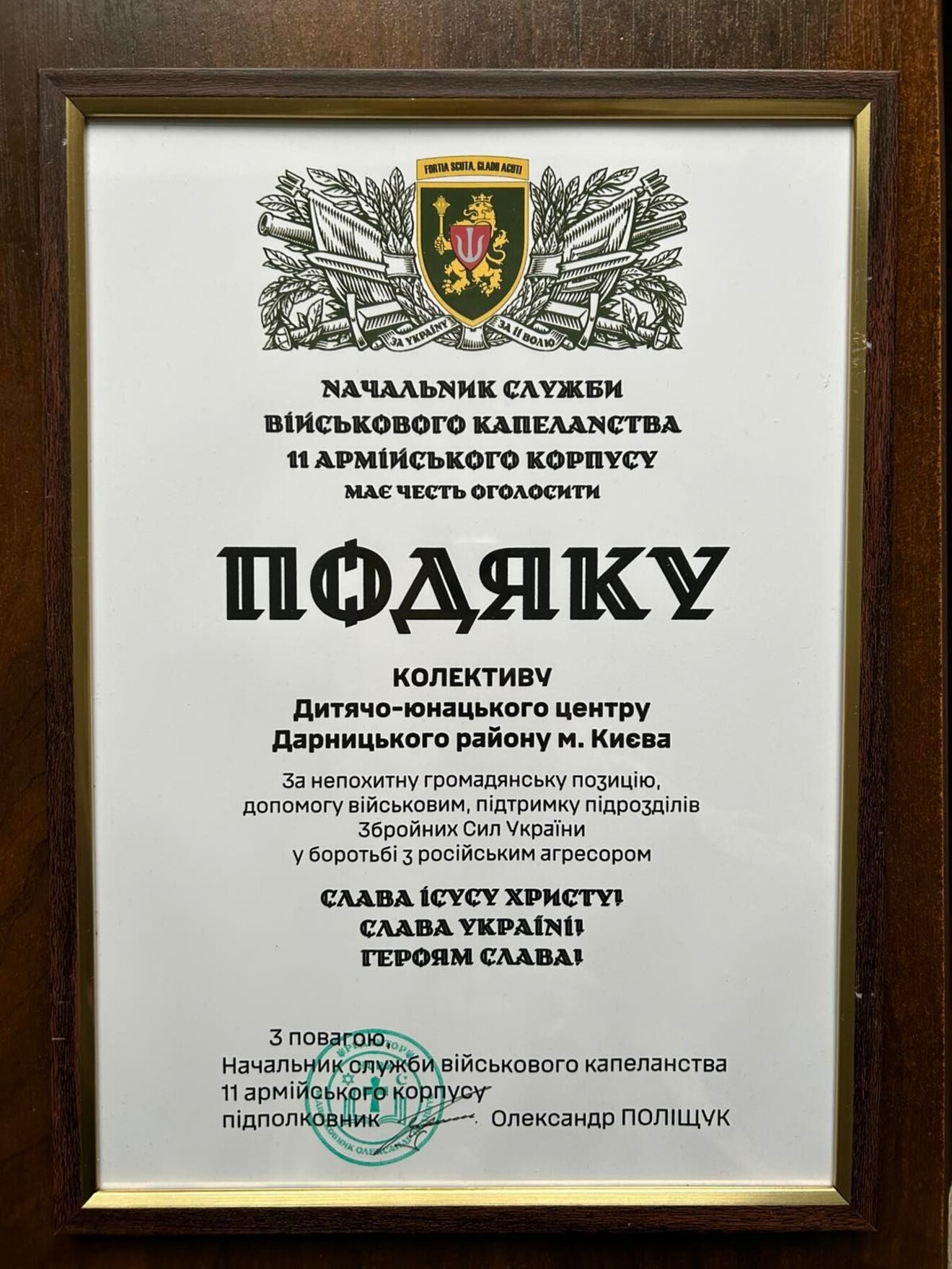 Щиро вітаємо Дитячо-юнацький центр Дарницького району м. Києва з отриманням Подяки начальника служби військового капеланства 11 армійського корпусу!