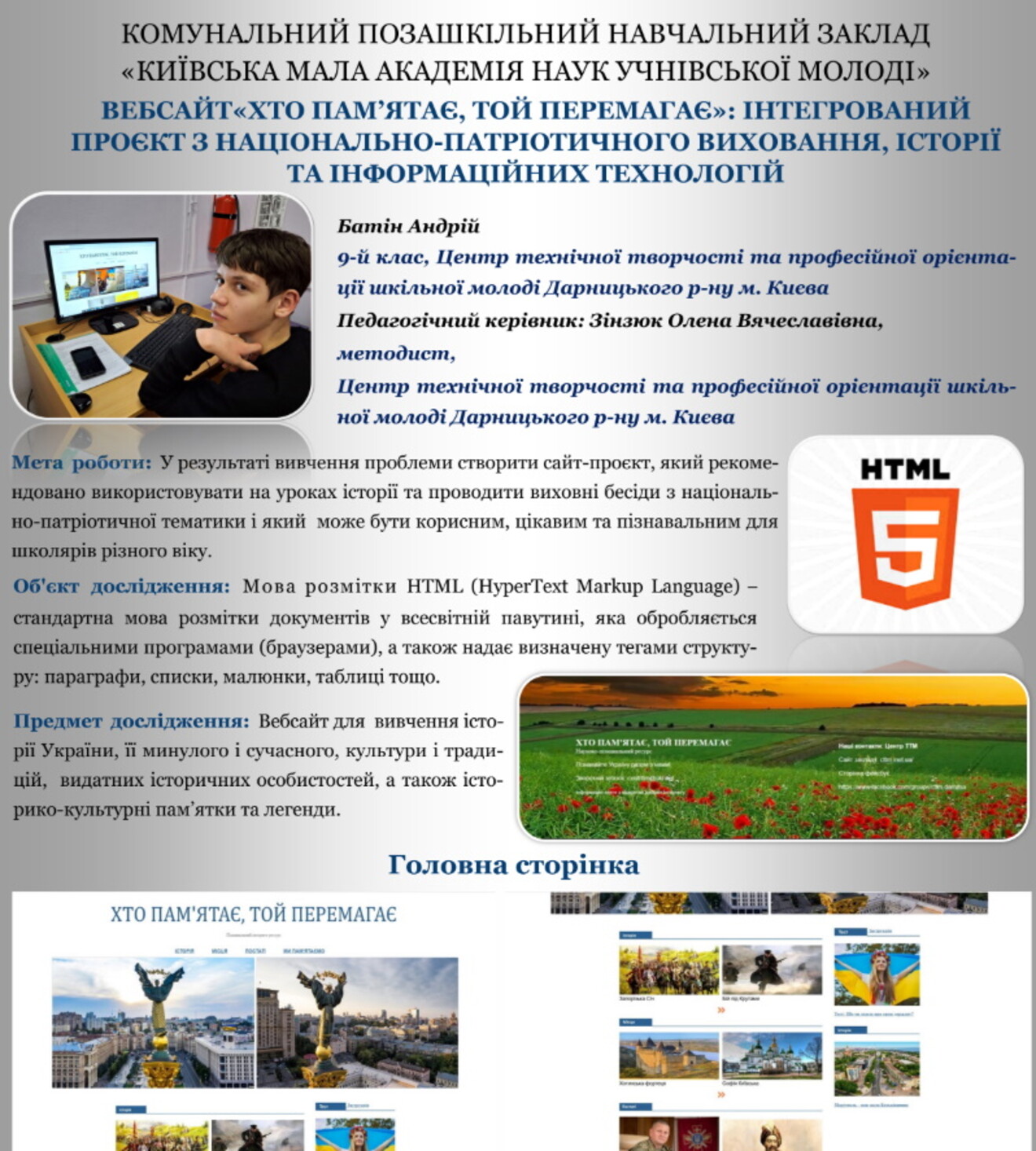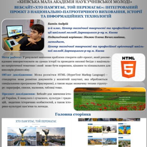 🔹 вебсайт «Хто пам’ятає, той перемагає: інтегрований проєкт з національно-патріотичного виховання, історії та інформаційних технологій» (Батін А.);
