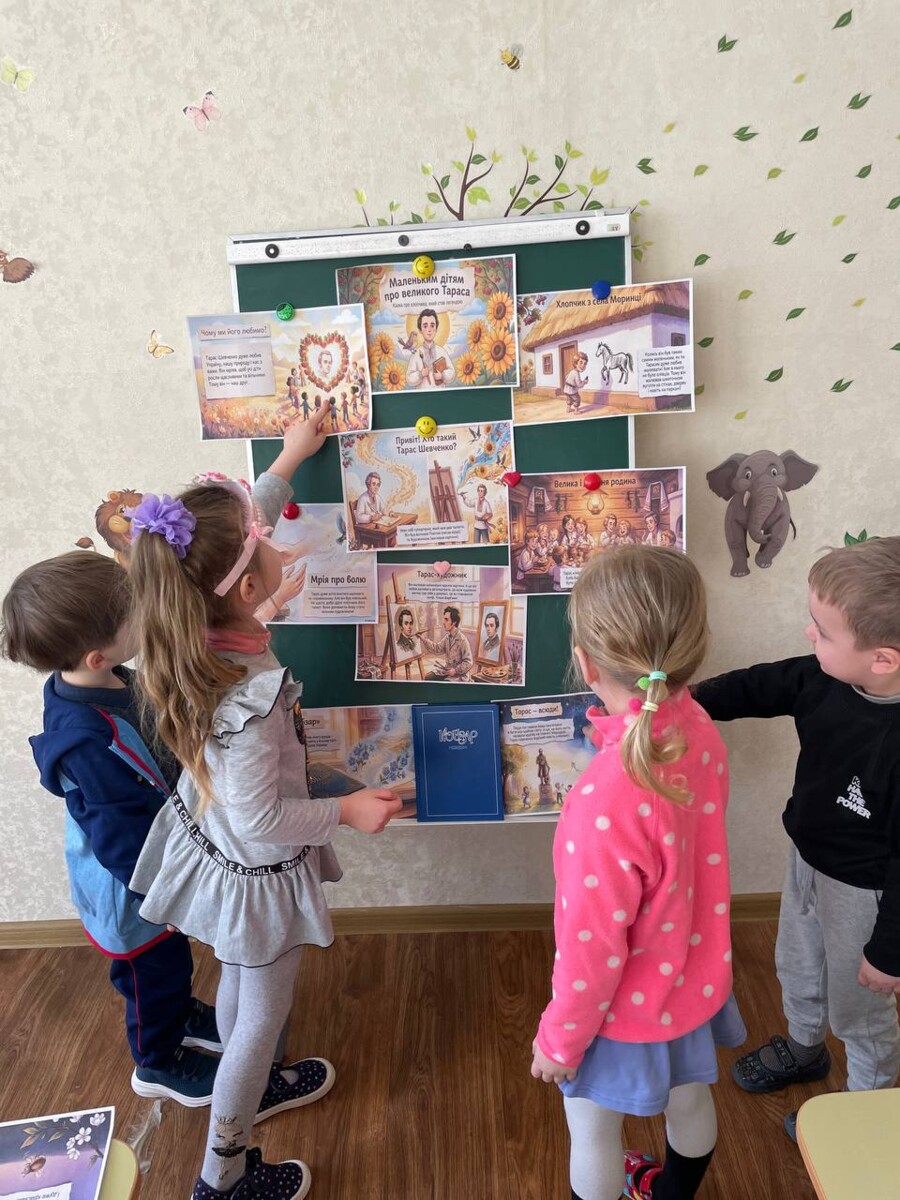 День 1 — «День народження Кобзаря» був присвячений життєвому шляху митця. Під час біографічних віталень вихователі знайомили малят із дитинством Тараса, використовуючи ілюстровані книги та презентації. У мистецькій майстерні діти створювали малюнки за мотивами ранніх творів поета, а під час бесід говорили про значення постаті Шевченка як символу волі.