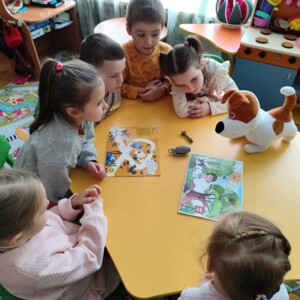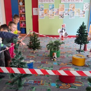 Малята переглядали навчальні відео, 🎬 знайомилися з попереджувальними знаками, ⚠️ брали участь у рухливих іграх «Стоп — небезпечно!» та створювали творчі роботи «Безпечні прогулянки», 🎨 також було влаштовано виставу «Пес Патрон і міни».